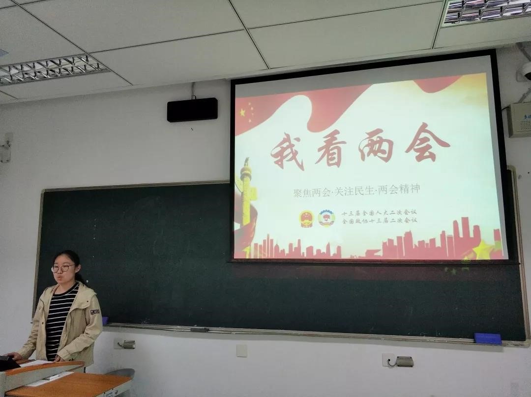 首先,陈怡名同学通过一段视频向党支部成员系统地阐述了什么是两会、全国人大代表的选举过程和人大代表与政协委员的异同等。随后,陈怡名同学从正风反腐、社会保障、脱贫攻坚三个方面介绍了两会精神和热点话题。进而介绍了我国政府脱贫攻坚、减税降费、医疗、通讯、环境和教育六大工作重点,并以此为话题展开了热烈的讨论。