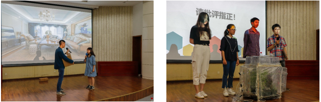 大赛伊始,主持人便向大家宣布了本次决赛的规则与形式,随后进决赛的十支参赛队伍按抽签顺序依次上台展示,他们或以小品形式演绎或以制作小型模型的形式现场模拟或以播放视频的形式给予动态感受,多样化的向评审老师和在场同学详细介绍方案思路,并自信地回答了老师提出的问题。三位老师就经济效益、方案可行性、重点突出等方面做出了点评与指导。