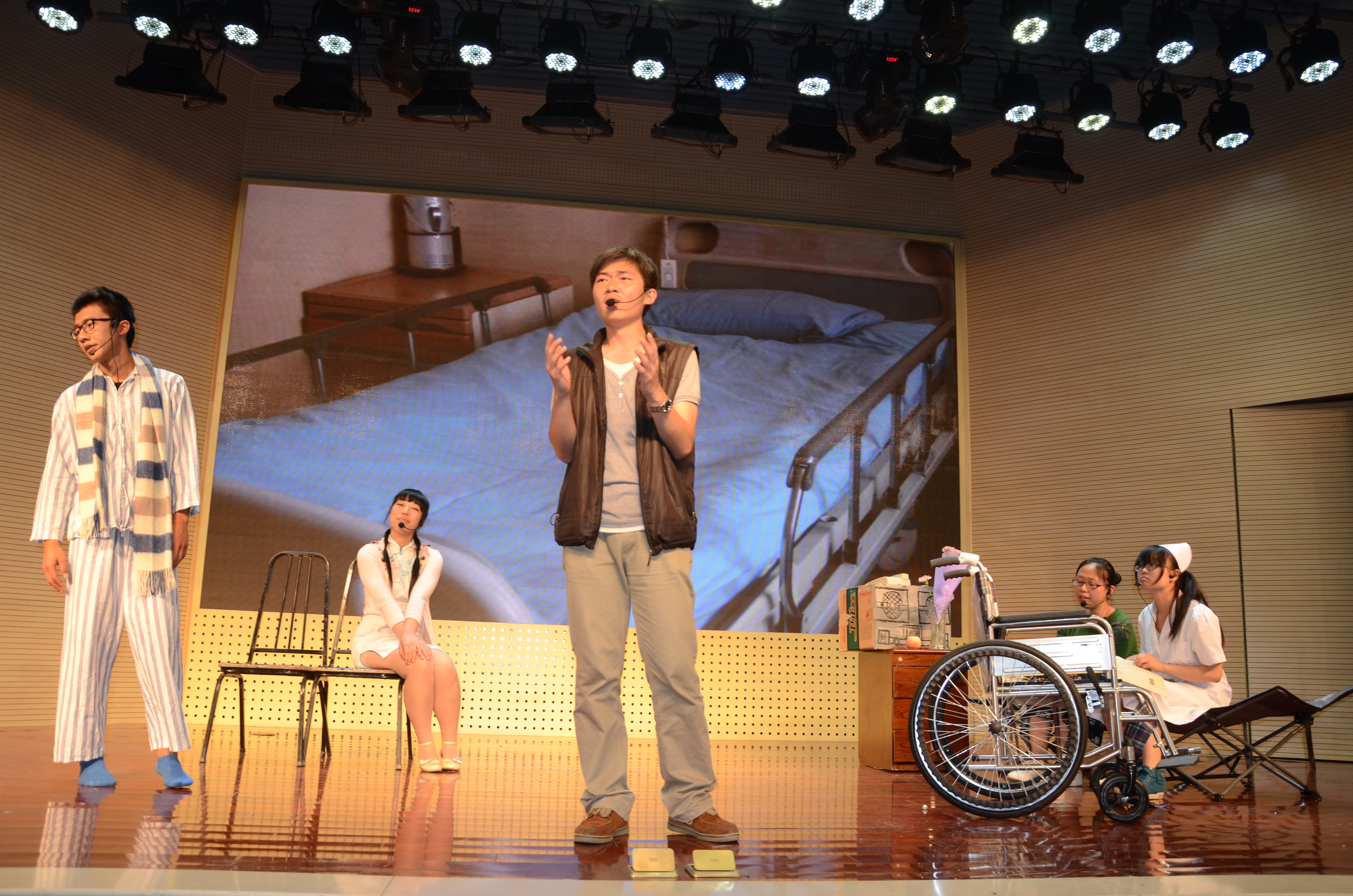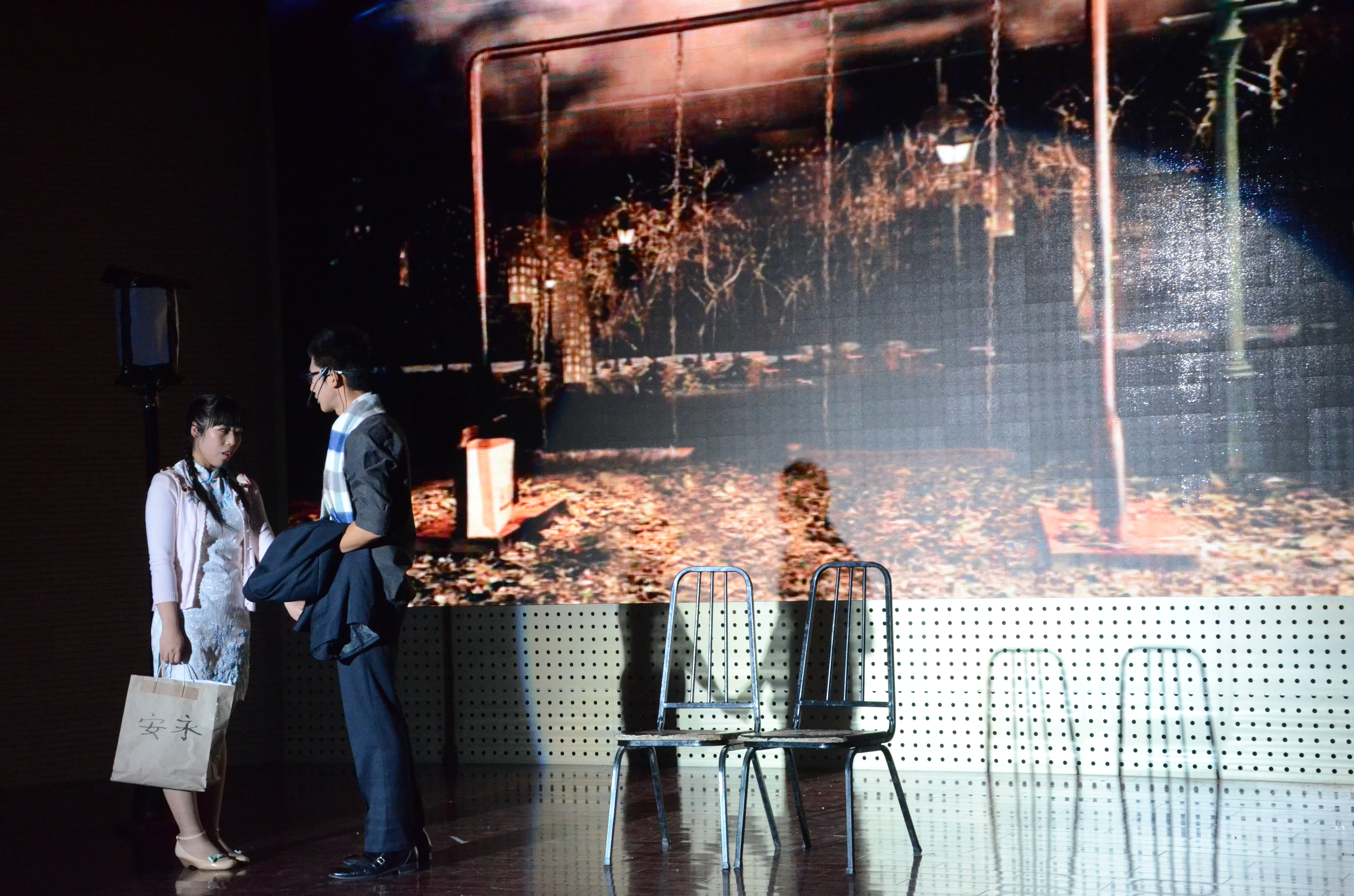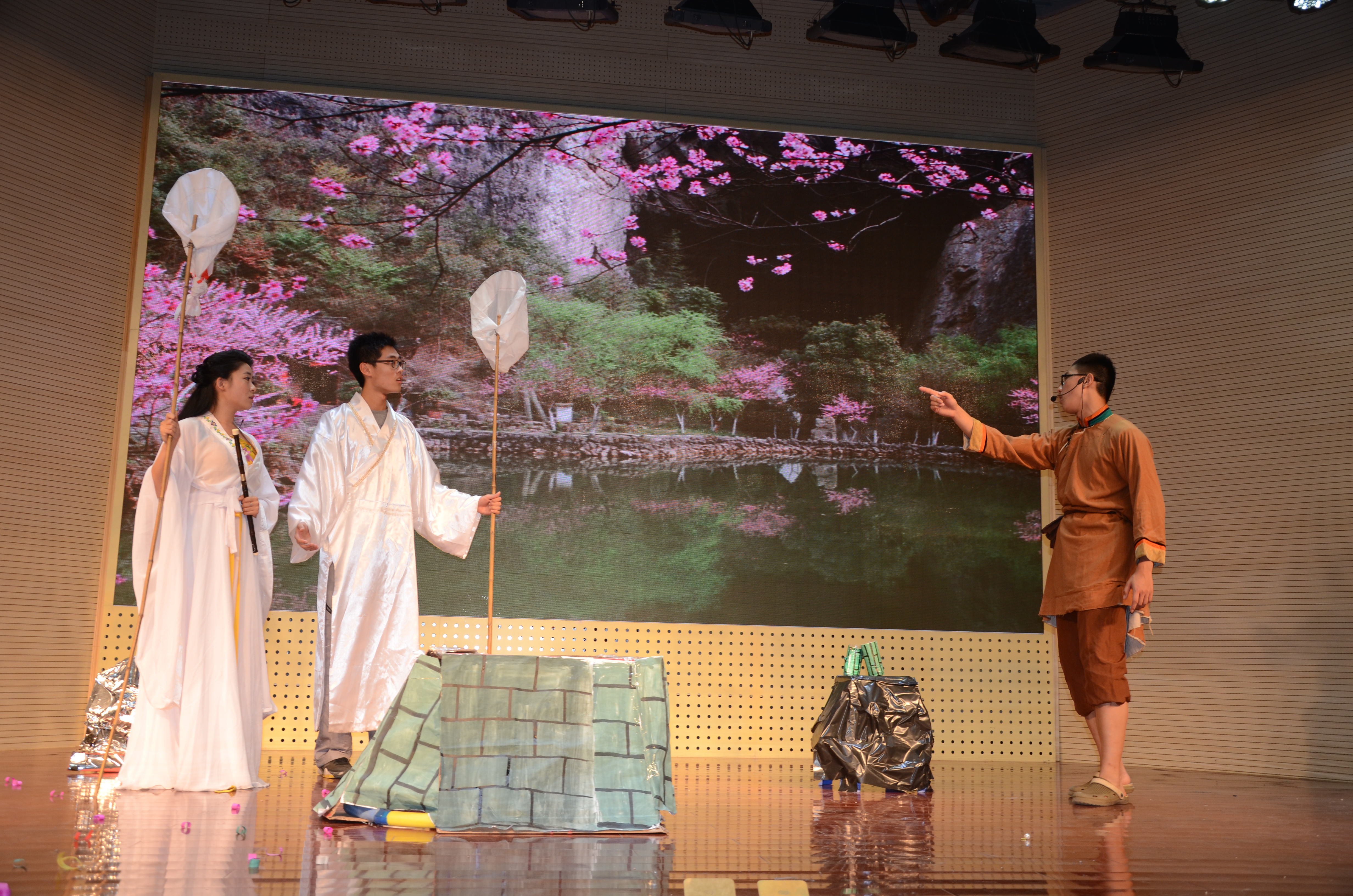 舞蹈团的开场舞和合唱团的《倔强》首先拉开了晚会的序幕,极大地渲染了晚会的气氛。而前ok138cn太阳集团合唱组合orange storm,也有5位成员来到晚会现场,带来了四首精彩的歌曲,将整场晚会在话剧开始前就首先带入了高潮。随着orange storm的演唱结束,晚会的主体话剧《暗恋桃花源》也正是开演。《暗恋桃花源》讲述了《暗恋》和《桃花源》是两个不相干的剧组,他们都与剧场签订了当晚彩排的和约,双方争执不下,谁也不肯相让。由于演出在即,他们不得不同时在剧场中彩排,遂成就了一出古今悲喜交错的舞台奇观。仲迎鑫和姜典良的《暗恋》唯美柔情,王一然、费澄和袁昊的《桃花源》则幽默风趣,这一经典的舞台剧目《暗恋桃花源》经ok138cn太阳集团艺术团成员的再次演绎,加上自己的一些原创元素,给大家带了一出精美绝伦的舞台盛宴。其中,种子121班的袁昊饰演的老陶语言幽默,表演生动滑稽,赢得了在场观众的数次掌声;同时,也使演出多次走向高潮。