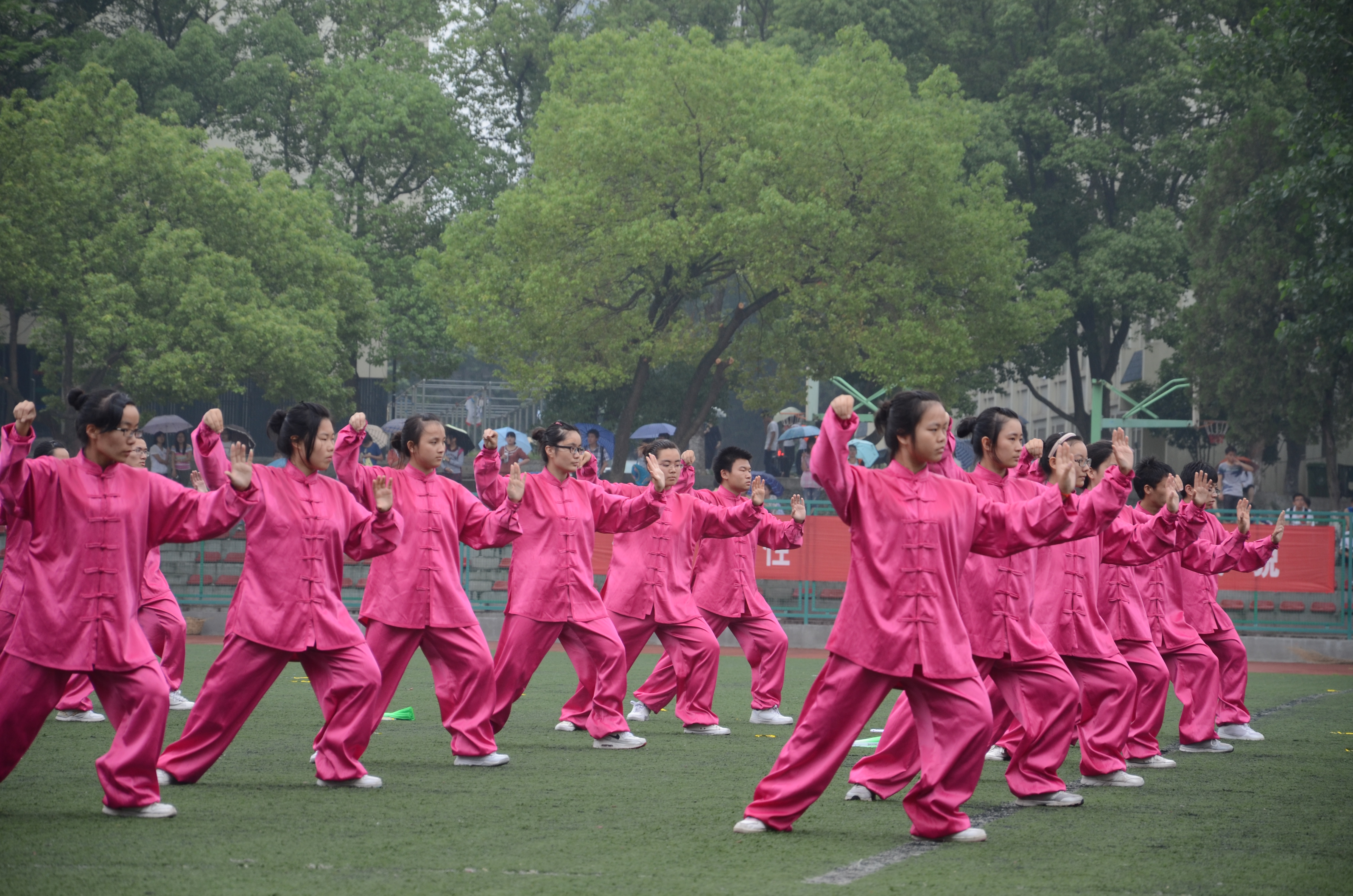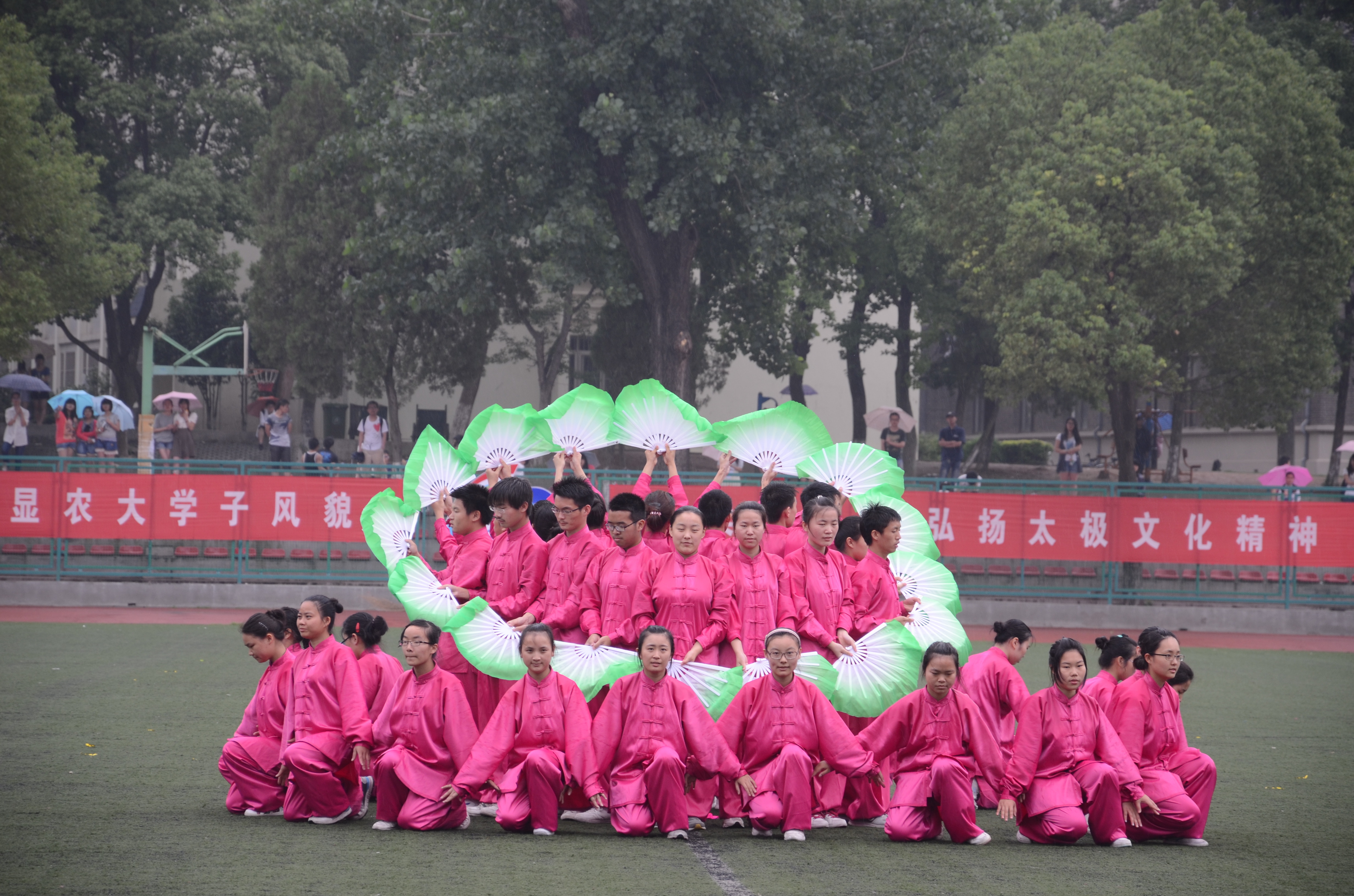 经过50多天辛苦训练,太阳官网代表队以饱满的精神状态参加了比赛。身着玫红色太极服的队员们构成了比赛场上一道亮丽的风景,巾帼须眉,相得益彰。以第十的出场顺序的ok138cn太阳集团,柔美清新的太极舞让评委与观众眼前一亮,整齐划一的太极展示更是获得了一阵阵的叫好,尽管天空下着小雨,但仍不能阻挡太极队员的参赛热情。经过两个多小时的激烈角逐,太极比赛完美谢幕,太阳官网以微弱差距排名第四,获得二等奖。